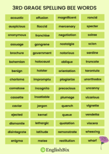 For all the smart 3rd graders who have a spelling bee coming, here is a list of more than 100 tough words that will help you sharpen all your skills and are most likely to appear in your spelling bee!