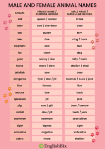 In this article we’ll give you the list of animals with their male and female version of names. This will give you a basic understanding of how animals are named and will be of great help if you ever had a question like what is the name of female dog ?, or what is the name of male cat ?