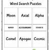 The word search printables test your knowledge of astronomy vocabulary which include words like albedo, Alpha, Centauri etc.