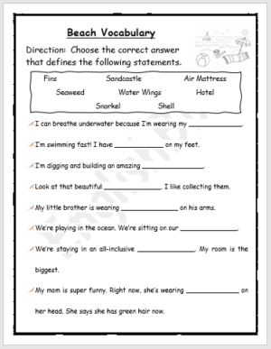 This is an ideal worksheet for students to improve their vocabulary about beaches. Undoubtedly, this makes for a great summer activity!