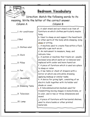 This is an ideal worksheet for students to enrich their vocabulary about the bedroom. This is a great activity to do with kindergarteners or Grade 1 students.