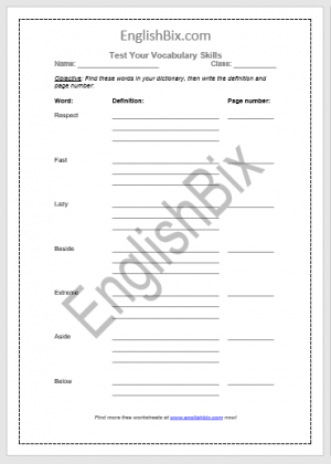 Your task in this simple worksheet is to Find the given words in your dictionary, then write their definition and page number.