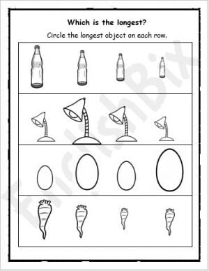 In this worksheet, your child will look at the pairs of objects in each box and circle the longest object. The pictures include: