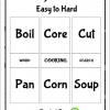 The search printables test your knowledge of items and terms related to cooking such as cut, core, soup.