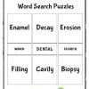 The word search printables test your knowledge of Dental vocabulary which include words like cavity, crown, cusp etc.