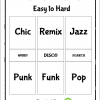 The search printables test your knowledge of terms associated with Disco such as remix, Jazz, pop.