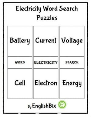 The word search printables test your knowledge of Electricity vocabulary which include words like current, circuit, electron etc.