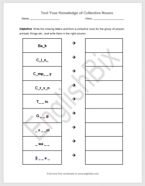 This is a medium level group words worksheets where your objective is to Write the missing letters and form a collective noun for the group of people/ animals, things etc., and write them in the right column.