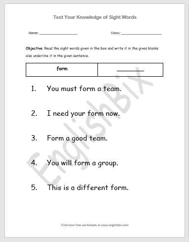 This is form sight word worksheet. Read the word given in the box, and write “form” in the given blank. Also underline the word in the given five sentences.