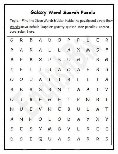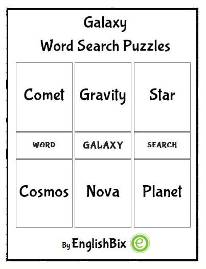 The word search printables test your knowledge of Galaxy vocabulary which include words like nova, nebula, gravity etc.