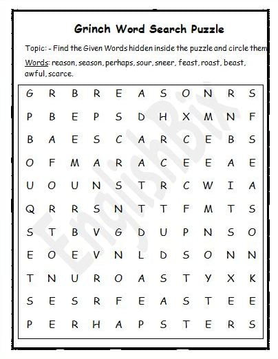The word search printables test your knowledge of Grinch vocabulary which include words like sour, sneer, feast etc.