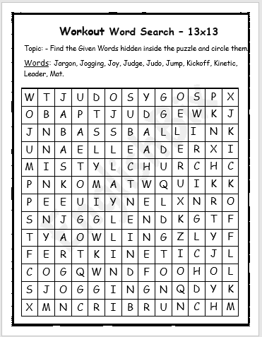 This printable worksheet includes easy-to-hard gym vocabulary words like jargon, jogging, joy, judge, judo, jump, kickoff, mat etc.