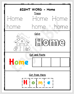 Practice ‘Home’ sight word with this fun worksheet where kids have to cut and paste the letters