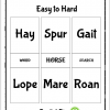 The search printables test your knowledge of terms related to Horse such as Spur , Muzzle, Hay.