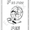 The Coloring sheets include uppercase(F) and lowercase(f), along with pictures of fan, four, flashlight, fish, frog, film and other words beginning with F.