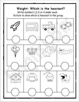 In this worksheet, your child will write numbers 1, 2, 3, or 4 under each picture to show which is the heaviest picture from each row.