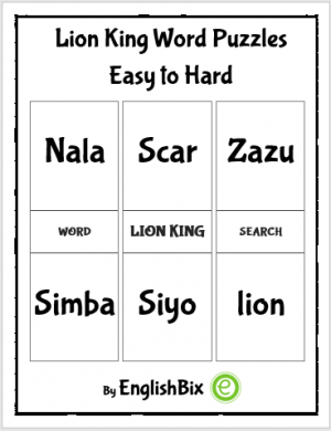 The search printables test your knowledge of lion king movie vocabulary which include words like scar, hyena, warthog etc.