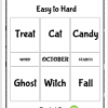 - An easy-to-hard word puzzle including words like candy, fall, and witch