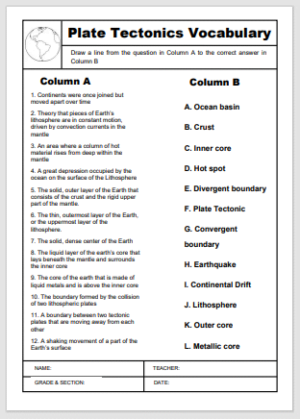 Learn plate tectonics terms and test your vocabulary with this easy to print matching worksheet.