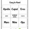 The worksheets include roman vocabulary word search ranging from easy to more difficult words like Hermes, Hera, Jupiter, Juno, etc.