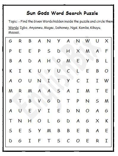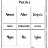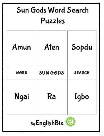 The word search printables test your knowledge of Sun God vocabulary which include words like Amun, Aten, Bast etc.