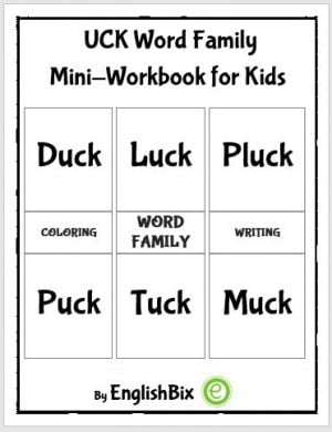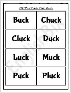 Learn about UCK words from this packet!. Teachers will find different set of UCK Family words like Tuck, Duck, Luck etc. to teach their elementary students.