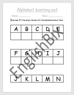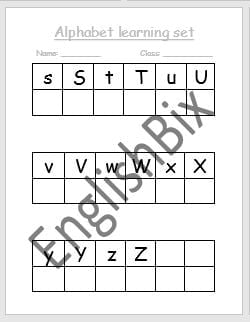 You have got a simple alphabet writing worksheet where you are given two joined rows of 5 alphabets each, the lower row consists of empty boxes.