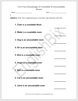 It is a simple worksheet for Countable and Uncountable Nouns test in which you have to Write “Yes” if statement given on the left is right otherwise write “No”.
